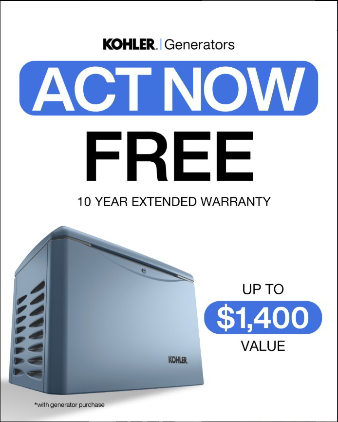 To qualify for this offer, a Kohler certified partner must submit the required online submission form and valid proof of order (consumer quote or invoice) by December 31, 2025. The generator must be installed and registered no later than May 31, 2026, by a Kohler certified partner. Offer not available at eCommerce or retail businesses, except Kohler certified dealers participating in Home Depot or Lowe’s retail installation programs. Kohler resellers are not eligible for this offer. Offer may not be combined with other offers or promotions. Generators registered by a non-certified Kohler partner or the homeowner are not eligible for extended warranties. Generators used in an off-grid/prime power application are not eligible for extended warranties.